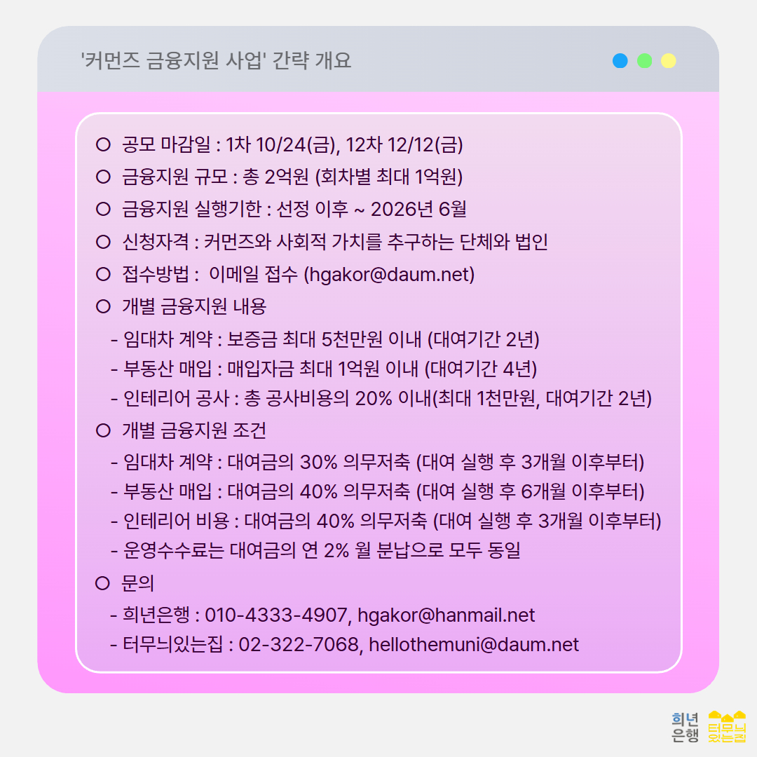 Email: hellothemuni@daum.net(터무늬제작소), ksif@daum.net(사회투자지원재단)